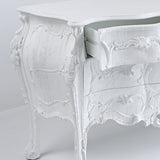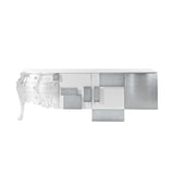 Sideboard made combining old and modern woodcraft. The classical side is made with blocks of solid wood, vertically placed, and carved by hand.
