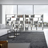 Brera is a bookcase available in two dimensions. Its main peculiarity are some vertical elements which break the linear continuity of the shelves. They have both a structural and a containing function. The position of these vertical elements is fixed and already foreseen on the shelves; it is possible, during the assembling, to decide whether the elements should be “open” or “closed”, giving more personality to the composition.
