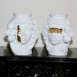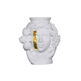A poetic ode to traditional craftsmanship and modern sensibility, this anthropomorphic vase of a Sicilian woman evokes the grandeur of the Moorish conquest in Sicily. Entirely handcrafted by master ceramicist Stefania Boemi, this vase boasts an expressive visage marked by an ornate headdress, pendant earrings, full lips, and luscious locks of hair intertwined with Sicilian fruits. The right eye features a gold foil band running vertically down the face, a captivating detail that emphasizes the beauty of the woman's gaze.