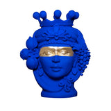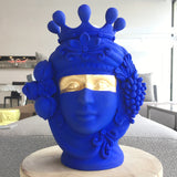 This unique work of art is sure to make a statement in an eclectic or modern decor, where it will be an ideal vessel to display floral compositions or as a statement sculpture. Its design is inspired by the Moorish-inspired sculptures in Sicilian ceramic tradition. The delicate features of the woman's crowned head are accented with flowers and fruit that are handcrafted and rendered with naturalistic details.