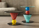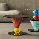 Small table defined by the new working process and the material used, a mix of glass fragments. Two elements, a cone and a sphere shaped through molds and differently juxtaposed to glass discs. Poured and finished by hand, creating a unique and exclusive product.