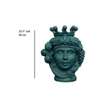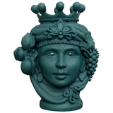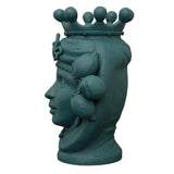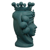 This anthropomorphic vase is made entirely by hand and painted in a green matte monochrome tint, rich in natural pigments and resin binders that provide intense color depth. Only the eyes are glazed so they stand out, emphasizing the beauty of the gaze. The piece is inspired by ancient Sicilian legends of love and revenge between a Moor and a Maiden.