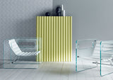 White leather armchair with adjustable seat. The openings in the glass sides form comfortable armrests.