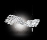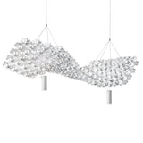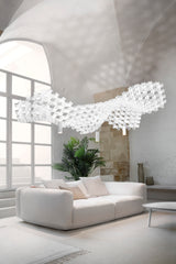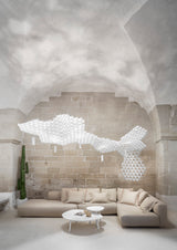 “We didn’t make a lamp, we made a ceiling”. Miguel Arruda introduces his work with Slamp with these words. The modular system started from the symbology he applied to a sculpture in 1980; Slamp’s R&D team transformed it, creating folded and jointed, meter-long hexagonal sections to be infinitely combined, filling a space with floating landscapes. Nuvem is a “ceiling”, illuminated by bidirectional spotlights.