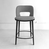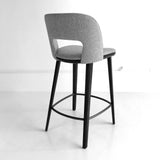 This bar stool is characterized by curves and harmonious lines which create a contemporary design, with references to the memory and tradition. Available in leather or fabric, with handmade stitching in view, has an upholstery that extends to cover the profile of the seat in correspondence to the inclined rear legs, with an aesthetic detail of great elegance.