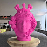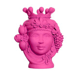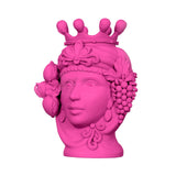 This unique work of art is sure to make a statement in an eclectic or modern decor, where it will be an ideal vessel to display floral compositions or as a statement sculpture. Its design is inspired by the Moorish-inspired sculptures in Sicilian ceramic tradition. The delicate features of the woman's crowned head are accented with flowers and fruit that are handcrafted and rendered with naturalistic details.