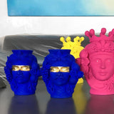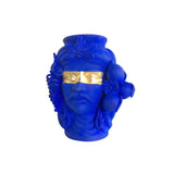 A superb work of art handcrafted of clay, this stunning vase depicts in a detailed way the masculine features of a Moor's head, adorned with fruit and flowers. Typical of the Sicilian tradition, this vase's innovative accent is given by a horizontal gold leaf enhancing the gaze of the man.