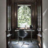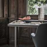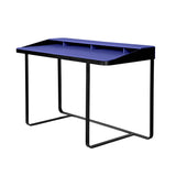 The twain desk has a lacquered brushed steel frame, which gives the base, the top and the secondary shelf their soft, rounded form. Both shelves of the top are upholstered in soft leather which emphasizes the welcoming nature of this desk.