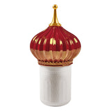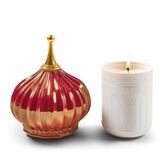 Candle for the home, designed in the shape of a tower, with a translucent porcelain container and red and gold lustre cover. Its scent carries such special ingredients such as cassis, lotus flower and frankincense.