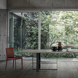 The Atelier dining table has a lacquered MDF top with a manual finish in cement composite in the colors of the collection, which define the opulent material effects. The base is made of a geometric form composed of brushed lacquered steel plates.