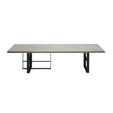 The Atelier dining table has a lacquered MDF top with a manual finish in cement composite in the colors of the collection, which define the opulent material effects. The base is made of a geometric form composed of brushed lacquered steel plates.