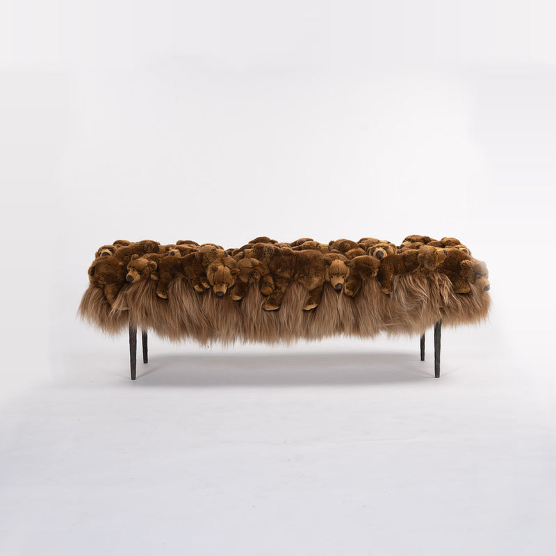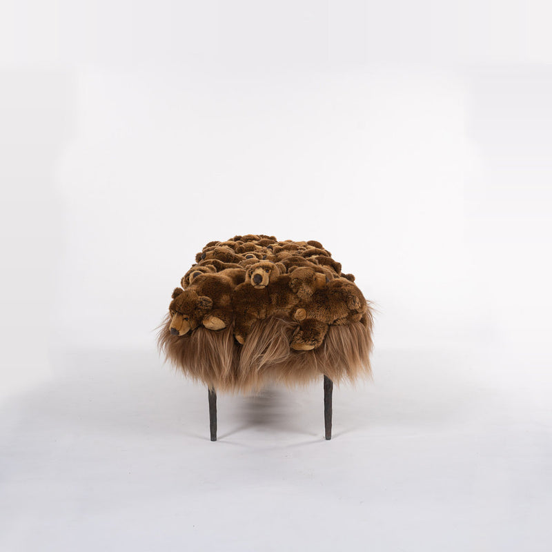 : Wood & metal, brown Icelandic sheepskin, polyester fabrics bears,