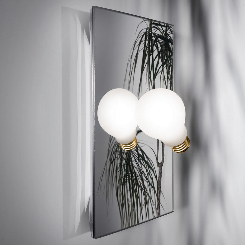 They say inspiration comes on like a light bulb going off in your head. Idea strips away design, leaving the essence of light; a three-dimensional “bulb” and a brass-finish screw base, magically suspended on a wall-base that comes in a brushed brass, mirrored, or white matte finish. Also available in a recessed wall lamp version that plays on the unexpected, ironic effect of an idea popping up when, and where, you least expect it.