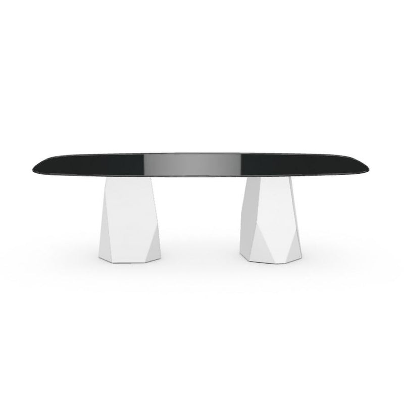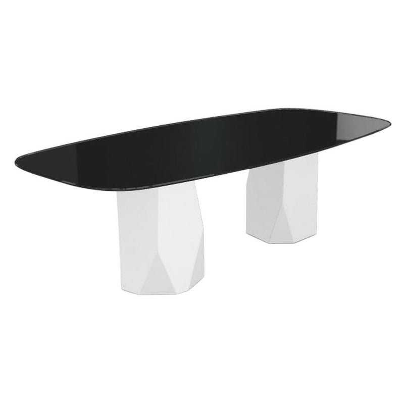 Menhir, dining table with two bases in glass or ceramic top. The base is available in matte white, graphite black or brushed brass. Custom size available up to 118 inches top.