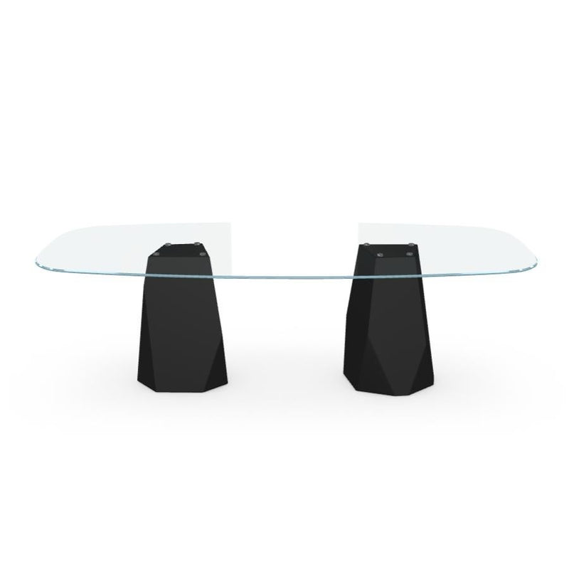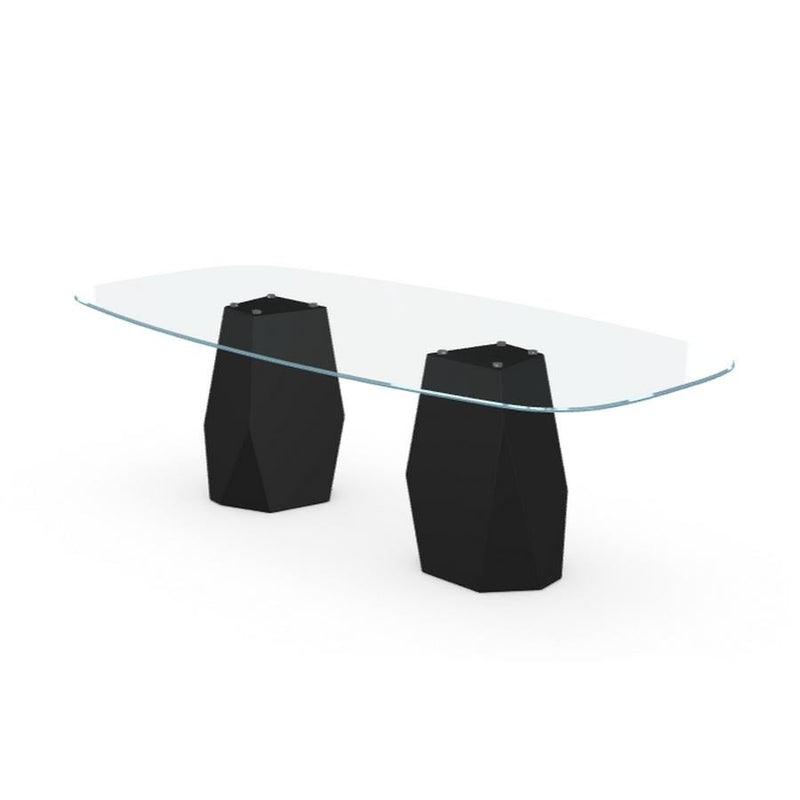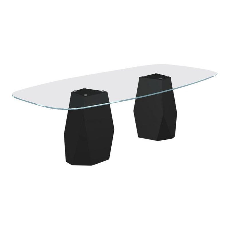 Menhir Two Bases, Dining Table with Clear Glass Top on Black Metal Base