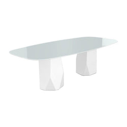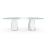 Menhir Two Bases, Dining Table with White Glass Top on Metal Base