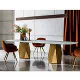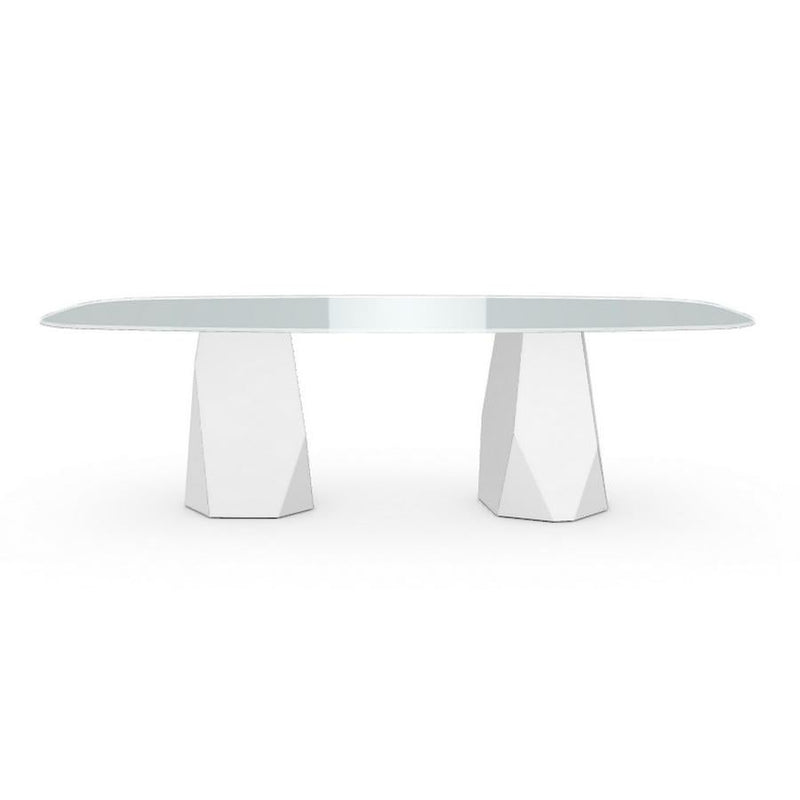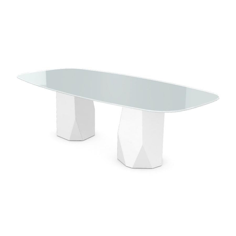 Menhir, dining table with two bases in glass or ceramic top. The base is available in matte white, graphite black or brushed brass. Custom size available up to 118 inches top.