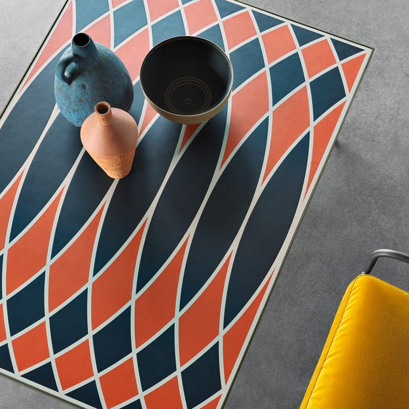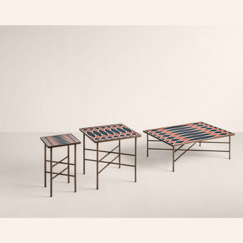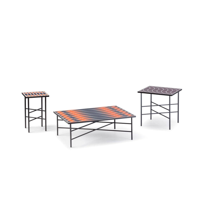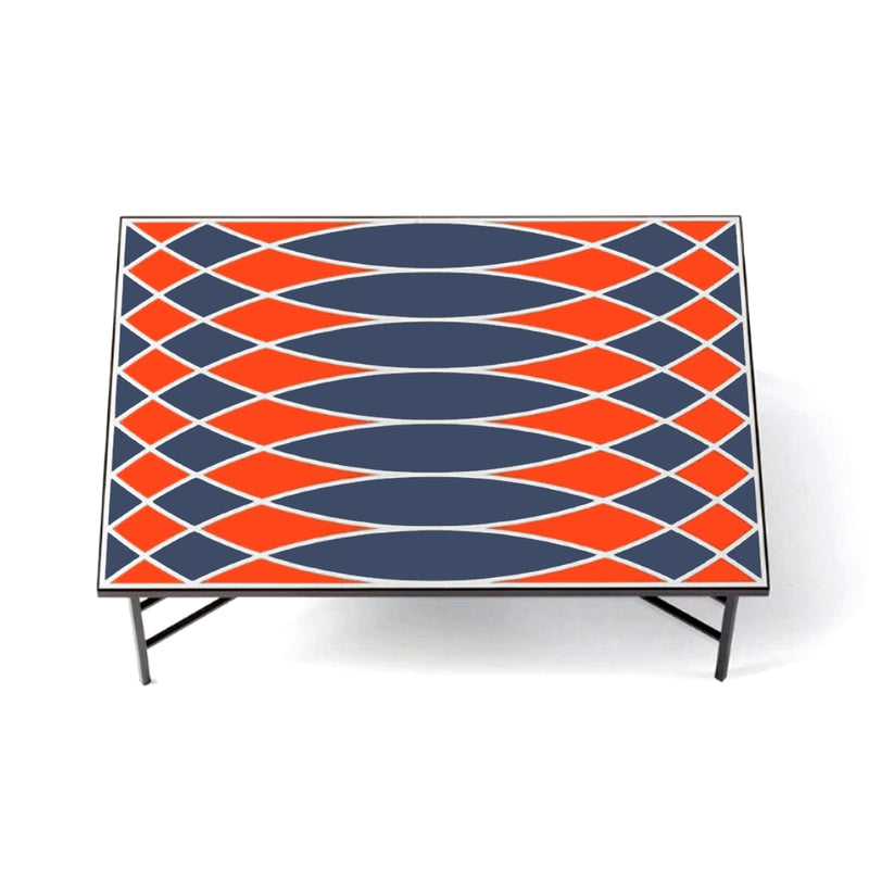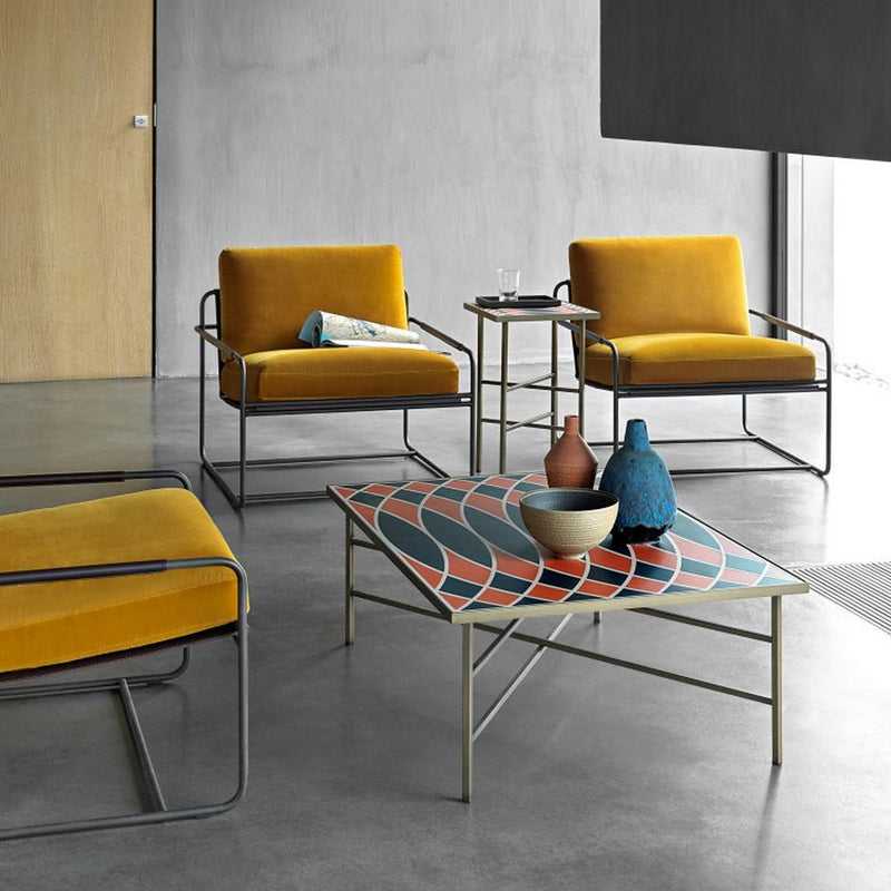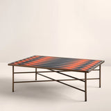Coffee table with painted steel frame and inlaid saddle leather coated top.