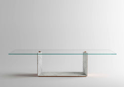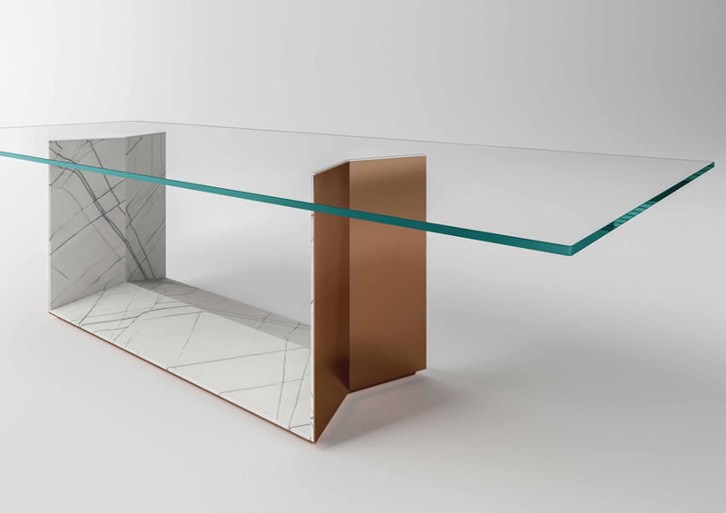 Structure in matte brushed marble available in Arabescato Orobico Gold, Tropikal Storm or Domus White. External sides in matte brushed Titanio or Terracotta finish. Tempered glass top in extra clear, glued to a metal plate in brushed stainless steel. Bases available in three different dimensions, that can accommodate glass tops in rectangular, square or round shape.