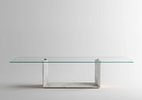The combining of materials and the great number of possible configurations and dimensions make it extremely easy to personalize the table, a great star of the dining space. The metal plate in brushed stainless steel glued to the glass top serves both to center the top and as terminal finish of the base.